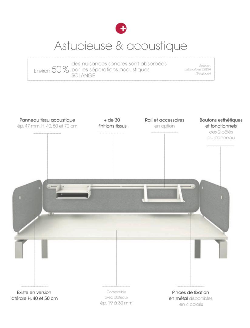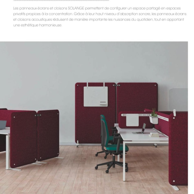 les panneaux écrans et cloison Solange permettent de configuré un espace partagé en espace privatif propice a la concentration. grâce a leur haut niveau d'absorption sonore,les panneaux écrans et cloisons acoustiques réduisent de la manière importante les nuisance du quotidien ,tout en apportant une esthétique harmonieuse.