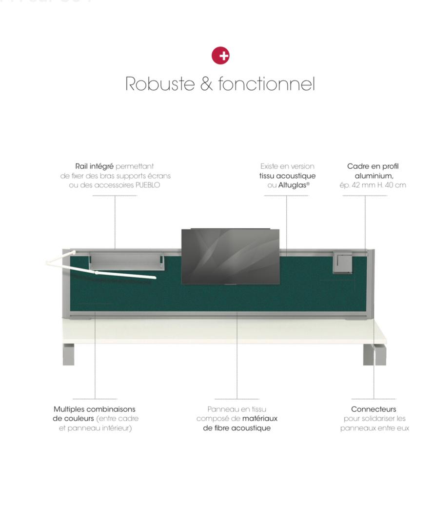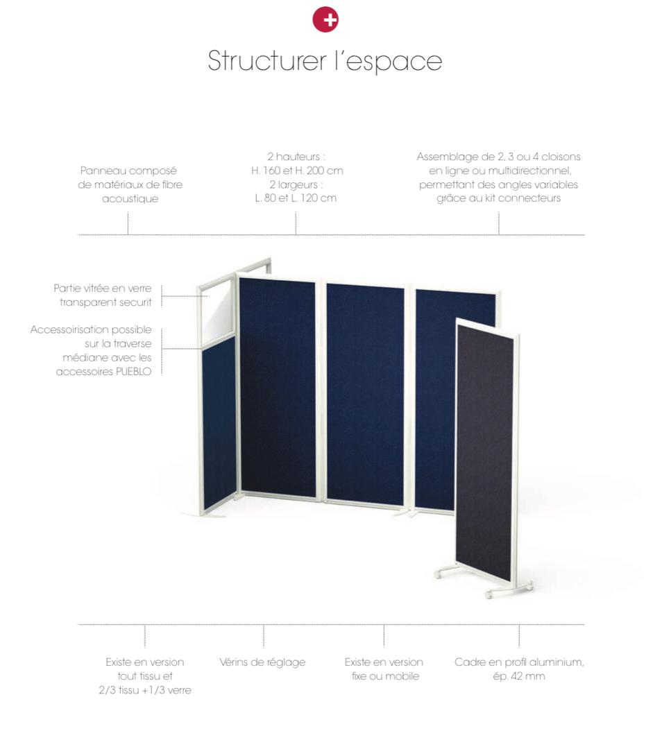 grace a ces acoustique et sa robustesse, lucien est idéal pour crée des espaces individuels permettant de s'isoler et se concentrer . les séparations se distinguent par une structure en aluminium qui peut accueillir un bras support écran et de nombreux accessoires permettant d'optimiser l'espace de travail. les cloisons en tissu ou semi vitré permettent de configuré des espaces dans un open-space.